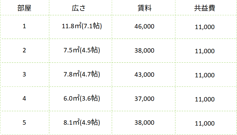 各部屋の賃料